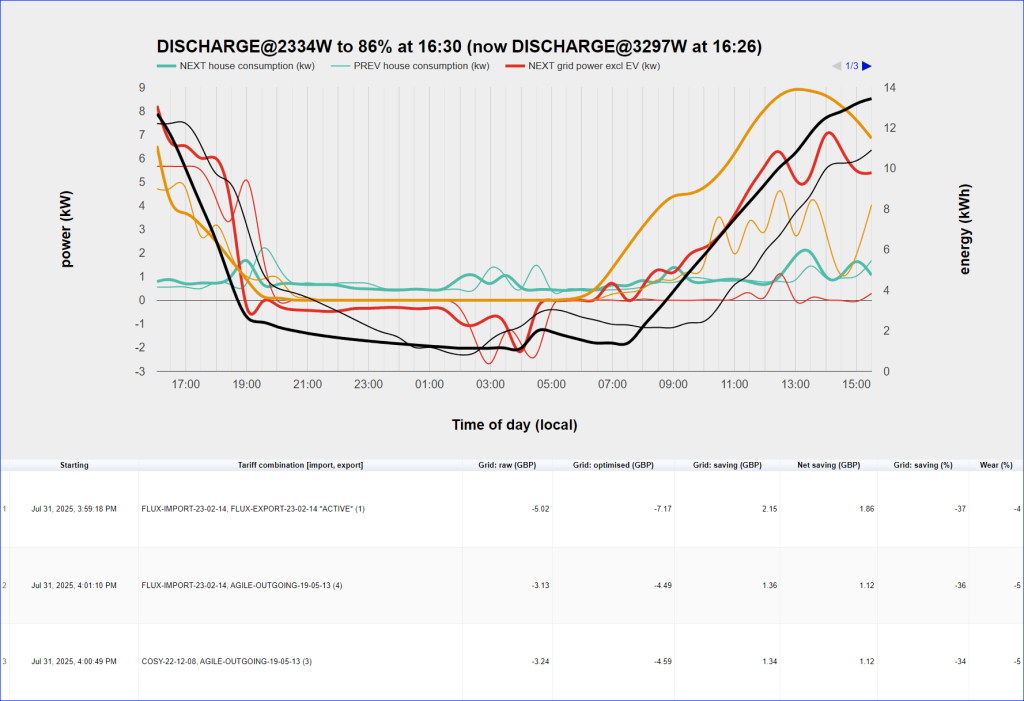 The optimiser requires only occassional monitoring and has been controlling our GivEnergy AIO battery for several weeks now. Below is an excerpt from its web dashboard:
